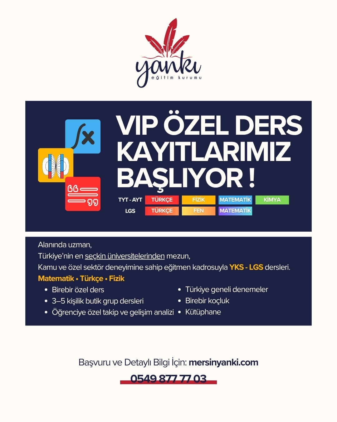 Yankı Eğitim Kurumları, Mersin’de akademik başarıyı disiplinli çalışma, doğru rehberlik ve güçlü eğitim kadrosu ile buluşturan köklü bir eğitim kurumudur. Son yıllarda elde ettiği Türkiye dereceleri ve istikrarlı sınav başarılarıyla adını güvenle duyuran Yankı, öğrencilerini sadece sınavlara değil, geleceğe hazırlar.
